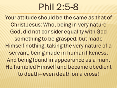 | Submitting To The God Of Power The thing about God is that He doesn’t just tell us what to do and how to live.  He is willing to pay the necessary prices to show us what to do and how to live.  Jesus, the God of all creation, came to this earth in the likeness of us humans.  He was willing to show us how to go about getting all that God has to offer.  Like children who need to submit to the examples, training, and authority of adults, we need to submit to the examples, training, authority of God.  Jesus is asking us to allow His attitude toward God to become our attitude.  One of the first things Jesus is giving us the faith and power to start trying to obtain is His attitude.  If we allow Him to give us the faith to start accepting His attitude, then it will make the rest of our spiritual growth come a lot easier.   Our attitude affects what we want and the way we think. Jesus is wanting to show you the way to a life of total victory through total submission to your heavenly Father. The example He is setting is coming from great possessions, power, position, and authority. | He started with it all and then gave it all up.  We started from nothing and gradually have gained a few possessions, positions, and power.  Our attitudes decide what we will do with them.  Jesus laid His life down for the needs of mankind.  He did whatever it took to help us spend eternity with our heavenly Father in His Kingdom.  Jesus is asking us to do the same.  Our price will never be as great as the one Jesus paid.  We will never have to give up so much that the price is too great.  Instead we just have to learn how to give up control of our lives so God can do what needs to be done to use us to help hurting people.  It is just a change of attitude.  Rather than us trying to get God to do what we want Him to do.  We yield to Him so we can do what He wants us to do.   Pray for a change of attitude. Ask Jesus to help you have the same attitude He had. Pray that He will help you yield your life to His plan. Let Him use you to meet the needs of yourself and those around you. Trust your heavenly Father enough to start letting Him take control and tell you how He wants your life to go. |