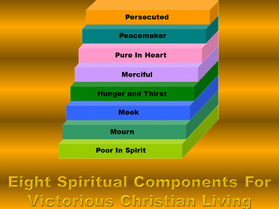 | Eight Spiritual Components JESUS’ SERMON: Mat 5:3-12: 1. Blessed are the poor in spirit, for theirs is the kingdom of heaven. 2. Blessed are those who mourn, for they will be comforted. 3. Blessed are the meek, for they will inherit the earth. 4. Blessed are those who hunger and thirst for righteousness, for they will be filled. |