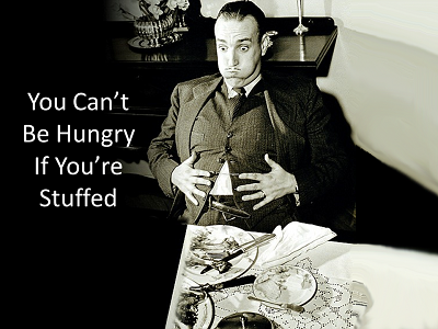 I’m Stuffed Hunger is caused by a need for food.  Thirst is caused by a need for something to drink.  Hungering and thirsting, in this situation, are the recognition of a spiritual need for righteousness.  The main thing that would keep us from experiencing this hunger and thirst would be because we were already filled with something else.  Usually that “something else” is a concern for the opinions of people or for having physical things.   |  | Mat 6:31-33 (NIV)  So do not worry, saying, ‘What shall we eat?’ or ‘What shall we drink?’ or ‘What shall we wear?’ For the pagans run after all these things, and your heavenly Father knows that you need them. But seek first His kingdom and His righteousness, and all these THINGS will be given to you as well.