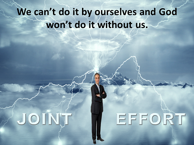 We can’t do it by ourselves and God won’t do it without us.   |  | If He were going to do it by Himself, He wouldn’t have bothered creating us.  We have been nothing but trouble ever since He created us.  The reason He created us was so we would learn how to work together with Him.  He, being the smart one in the relationship, means we are going to have to learn to follow His lead.  Obedience is a big part of our relationship with God.