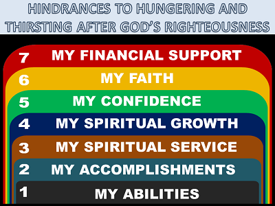 Just like worldly cares block off our hunger and thirst for righteousness, so does pride block it off. Pride causes us to look to our own righteousness. We get to thinking that we are growing spiritually rather than seeing spiritual growth as a greater yielding to Jesus’ life and ministry. Looking at our own abilities, accomplishments, works of spiritual service, and benevolence keep us from hungering and thirsting after God’s righteousness. Our body rewards us with feelings of accomplishment and SELF-esteem, when we are looking at our own righteousness. |