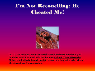 | Reconciliation Shouldn't Things Be Fair? Luke 6:34-35 (NIV)  And if you lend to those from whom you expect repayment, what credit is that to you? Even ‘sinners’ lend to ‘sinners,’ expecting to be repaid in full.  But love your enemies, do good to them, and lend to them without expecting to get anything back.  Then your reward will be great, and you will be sons of the Most High, because He is kind to the ungrateful and wicked.   | What is important to God?  Relationships.  This guy deserved to get his inheritance from his brother.  Why should he be warned about greed?   In this man’s case he wasn’t being covetous. He was simply wanting what he had coming to him. His brother was cheating him out of his portion of the inheritance. That isn’t fair. Let’s take a look at how God views this kind of thing. You Are Missing The Point 1 Cor 6:7 (NIV)  The very fact that you have lawsuits among you means you have been completely defeated already. Why not rather be wronged? Why not rather be cheated? |